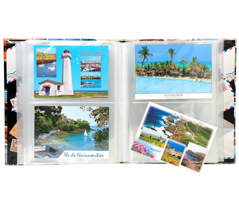 Album de collection pour cartes postales avec couverture en carton imprimé pelliculé brillant.